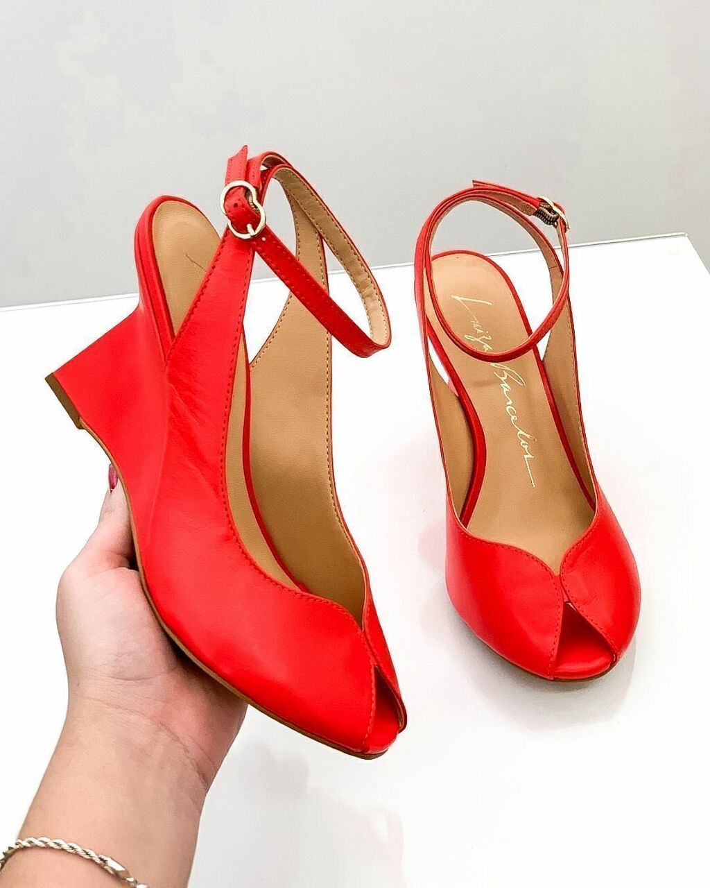 Elegante e ousada, esta sandália em couro vermelho traz o charme do design peep toe aliado ao salto anabela escultural, que garante impacto visual e conforto ao caminhar. A delicada tira no tornozelo com fivela ajustável adiciona feminilidade e sofisticação, tornando o modelo ideal para composições versáteis que vão do dia à noite. Atemporal e cheio de personalidade, é um verdadeiro statement no closet.
