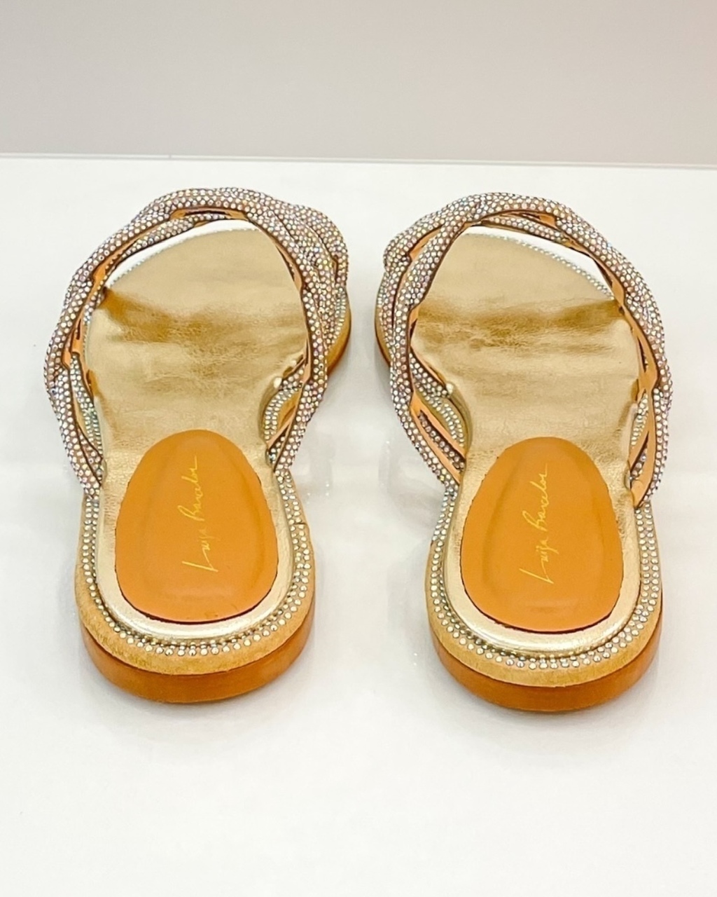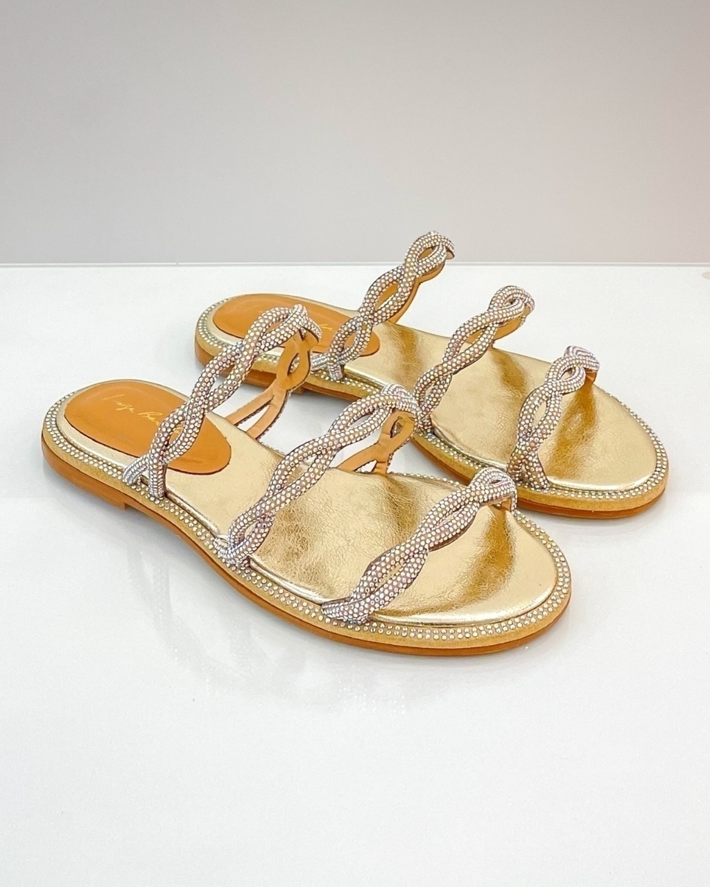 Combine com uma produção mais básica ou se jogue em algo totalmente avant garde. A sandália rasteira Luiza Barcelos possui três tiras totalmente em cristais que realçam os pés. O modelo produzido em material tecnológico no tom dourado, possui bico redondo e detalhe de aplicações de nano cristais na palmilha